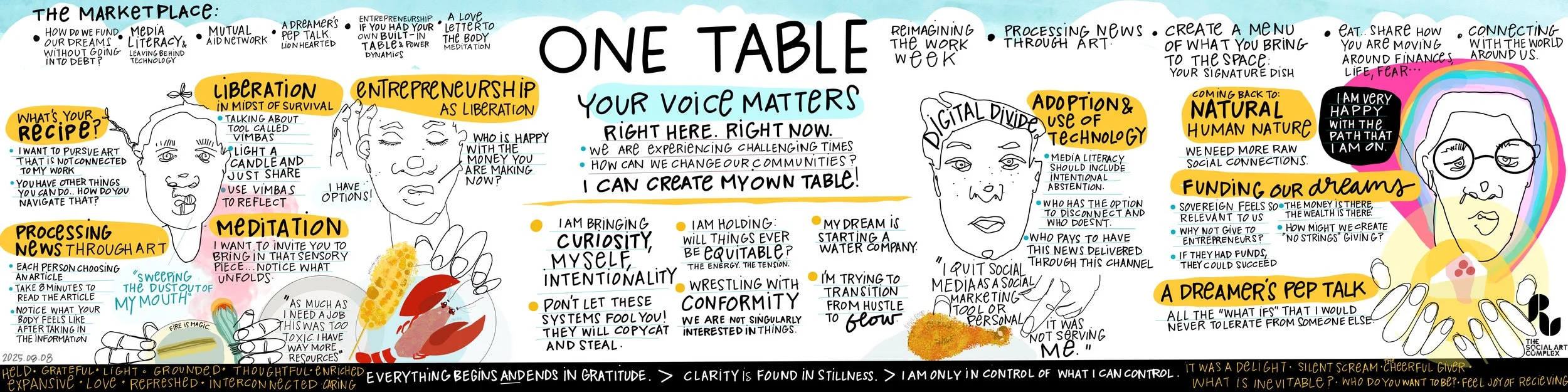 Our Table is where we feed each other—intellectually and emotionally. It is a place to come for sustenance, strength-building, to share resources, and to spark action. Whether you bring a daily practice, a system-building idea, a question, or a dream, there is a place for you here and in the future we want to be living in.